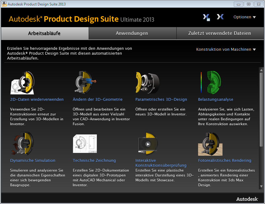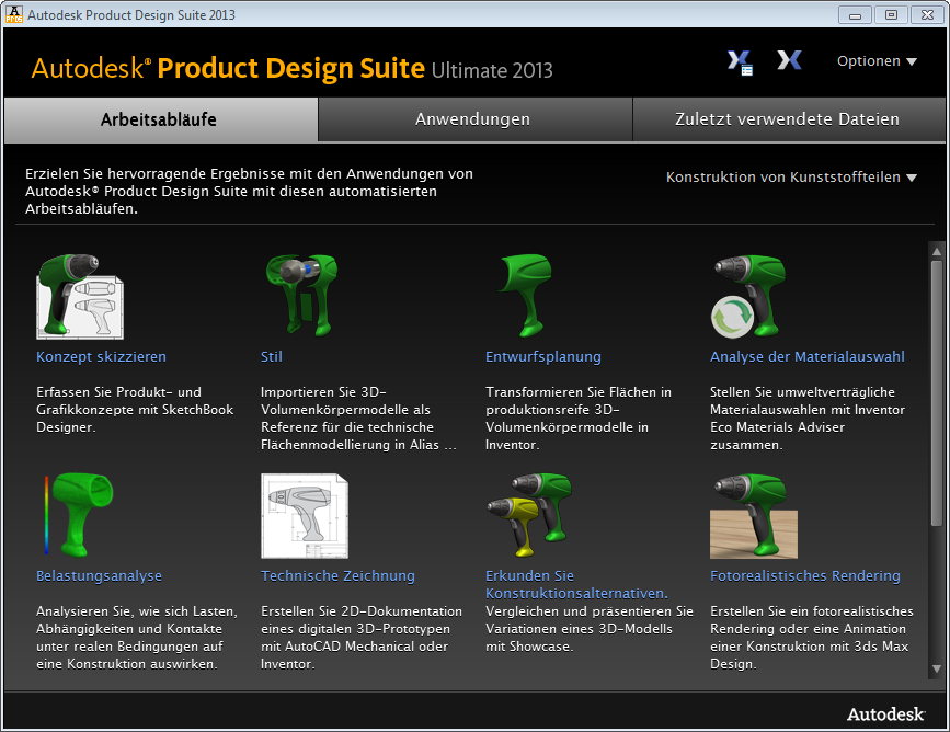 Dieses Launchpad der Autodesk Product Design Suite ist das Portal zu den Anwendungen, Projektdaten und Arbeitsabläufen innerhalb der Product Design Suite.