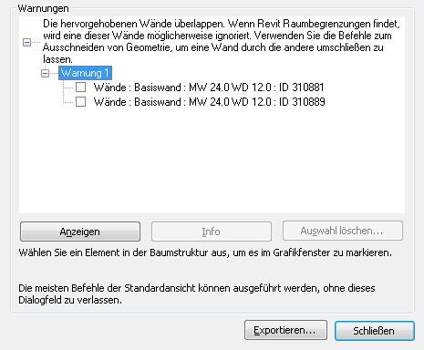 Wenn zu einem in einer Zeichnung ausgewählten Element Warnungen vorhanden sind, enthält die Registerkarte Ändern für dieses Element eine Gruppe Warnungen mit dem Werkzeug Zugehörige Warnungen anzeigen. Durch Klicken auf dieses Werkzeug können Sie eine Liste mit den zum Element gehörigen Warnungen anzeigen. Diese Warnungen werden im Bereich Meldungen des Autodesk Revit LT 2014-Dialogfelds aufgelistet. Die folgende Grafik enthält eine Liste mit Warnungen.