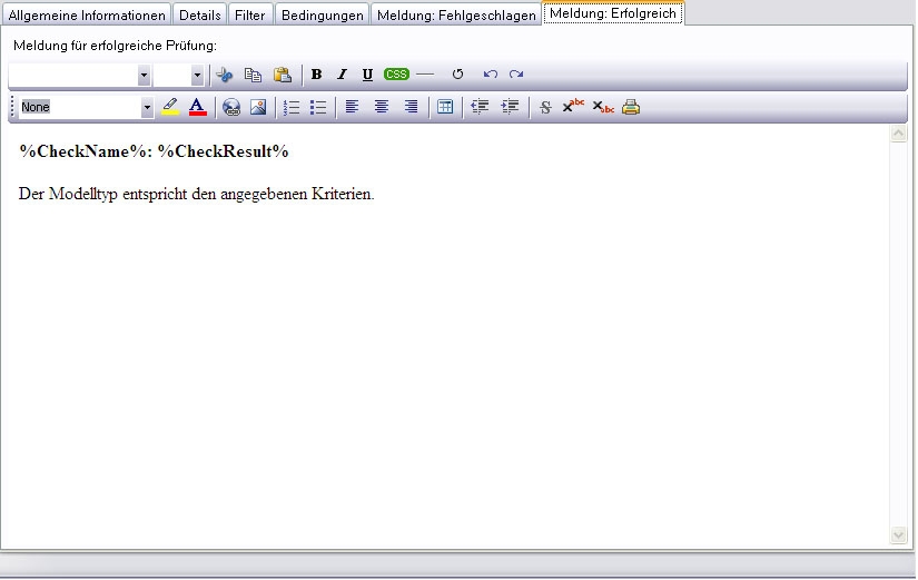 Auf der Registerkarte Meldung: Erfolgreich legen Sie die Meldung fest, die im Ergebnis-Browser angezeigt werden soll, wenn die angegebenen Kriterien bei einer Prüfung erfüllt werden: