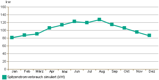 In Energieanalysen mit Autodesk® 360 Energy Analysis im Dialogfeld Ergebnisse und Vergleich zeigt dieses Diagramm den geschätzten Spitzenwert für den Strombedarf des Projekts nach Monaten. Der Spitzenbedarf ist die maximale punktuell auftretende elektrische Last.