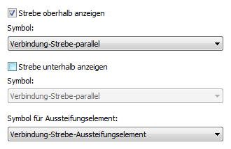 Symboldarstellungen von Streben in Draufsichten werden als Linien mit Winkel angezeigt. Wenn die Strebe und die Ebene sich schneiden, beginnt eine solche Linie an diesem Schnittpunkt, andernfalls an dem Punkt auf der Strebe, der der Ebene am nächsten liegt. Das Symbol erstreckt sich von dort über den Teil der Strebe, der über bzw. unter der Ebene liegt, nach oben bzw. unten.