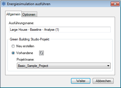 Benennen Sie den Simulationsdurchlauf, und geben Sie das Green Building Studio-Projekt an. ![]() |