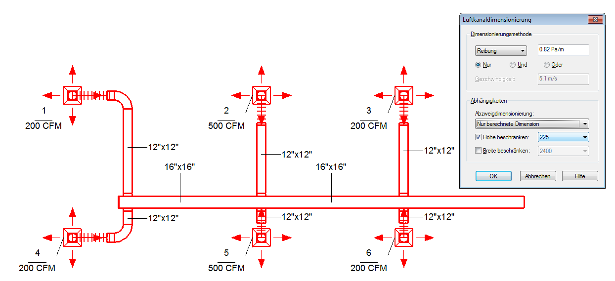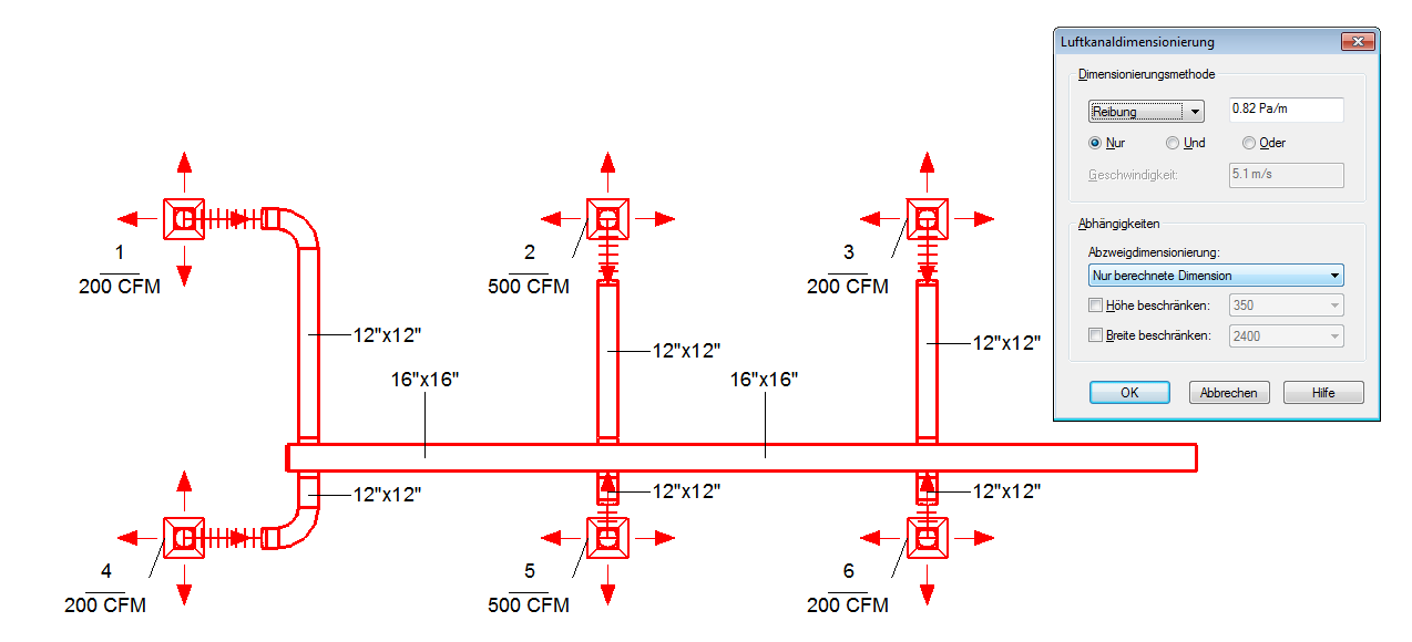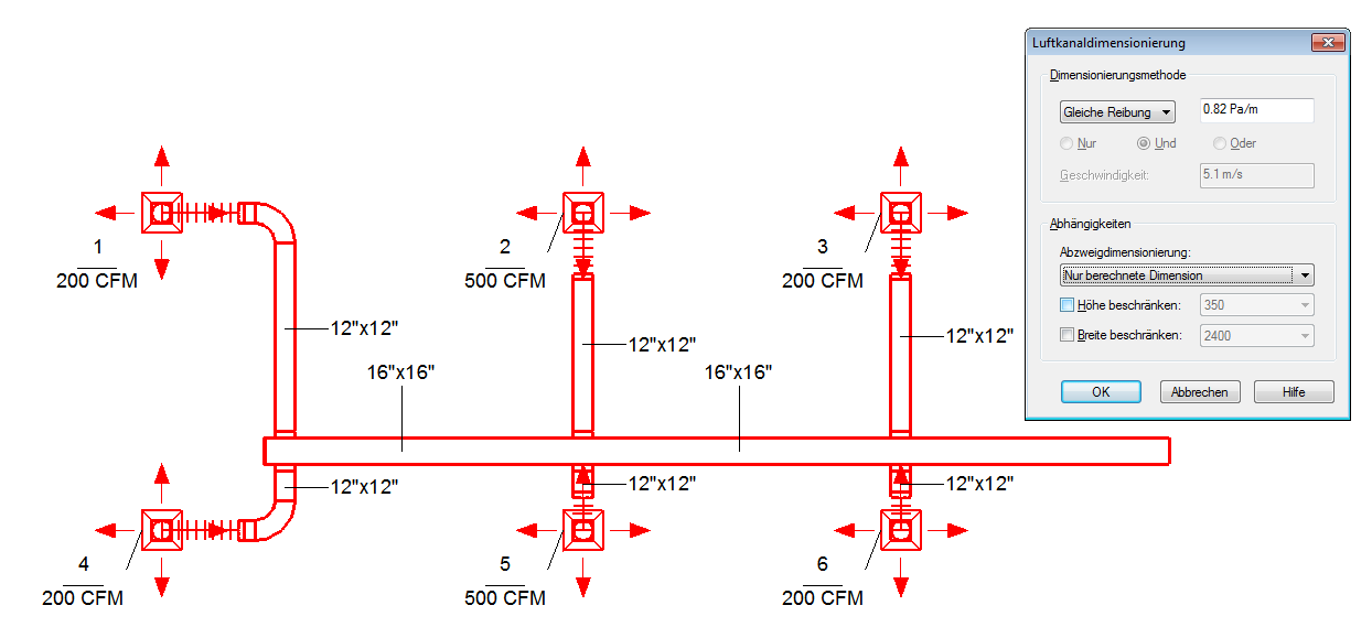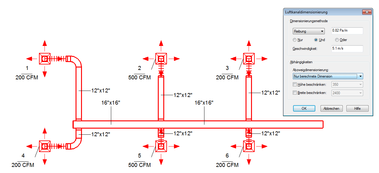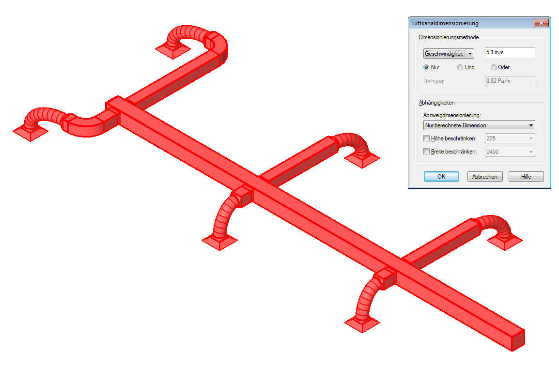 Die folgenden Abbildungen zeigen das Ergebnis der verschiedenen Methoden zur Dimensionierung von Luftkanälen.