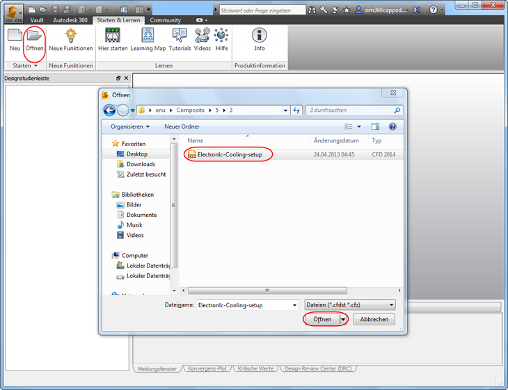 3. Klicken Sie zum Öffnen des Modells in der Multifunktionsleiste auf der Registerkarte Starten & Lernen auf Öffnen, wählen Sie die CFZ-Datei aus, und klicken Sie auf Öffnen.