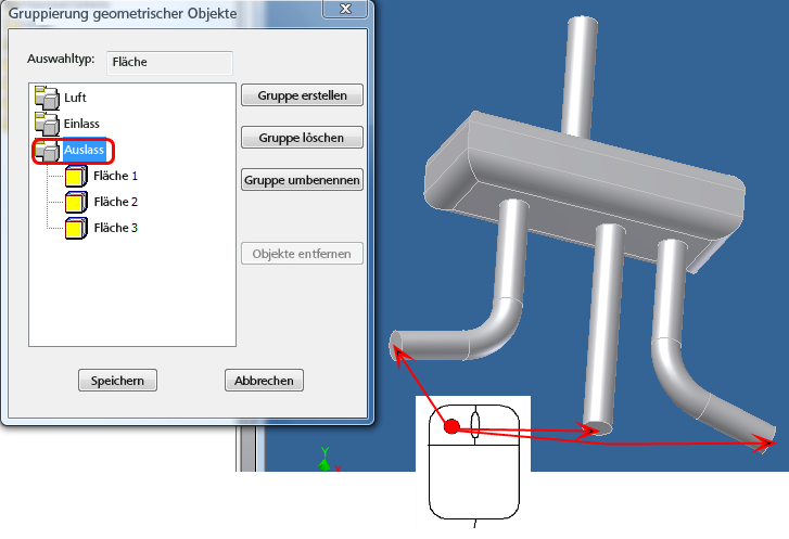 Wählen Sie Flächen. Geben Sie "Auslass" als Gruppennamen ein.