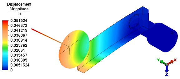 Run Simulation. After solid meshing, the analysis proceeds and the model displays in the Results environment. The displacement magnitude is presented initially by default. The maximum displacement is approximately 0.052 inch.