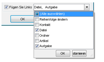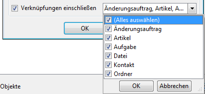 Wenn die Auswahl eine Verknüpfung zu einem Artikel beinhaltet, wird die primäre Verknüpfung des Artikels vorgabemäßig im Dialogfeld geladen. Die zugehörigen, abzurufenden Daten werden durch die Beziehungen der primär verknüpften Datei bestimmt. Wenn beispielsweise Anlagen einbezogen werden sollen, werden Anlagen zur Datei einbezogen, und nicht zum Artikel.