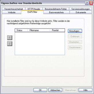 - Klicken Sie im Dialogfeld Eigenschaften der Vorgabewebsite auf die Registerkarte ISAPI-Filter.