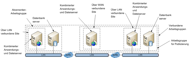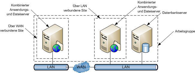 Sie können Dateispeicher von einem Standort zu einem anderen Standort replizieren. Dies geschieht über eine Microsoft SQL-Datenbank. Diese bei der Replikation verwendete Konfiguration wird als Arbeitsgruppe bezeichnet. Die folgende Abbildung zeigt eine typische Arbeitsgruppenkonfiguration. Alle Standorte in einer Arbeitsgruppe nutzen den gleichen Microsoft SQL-Server.