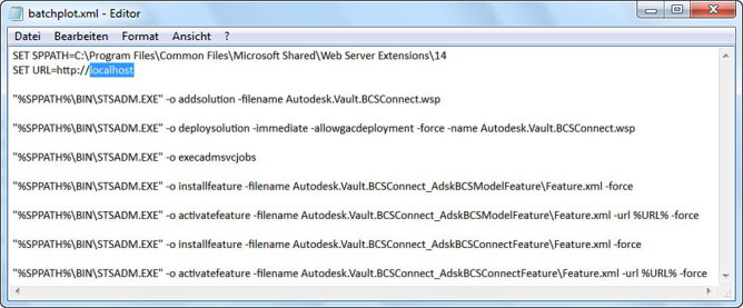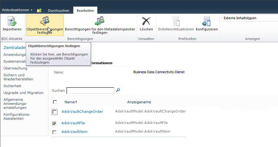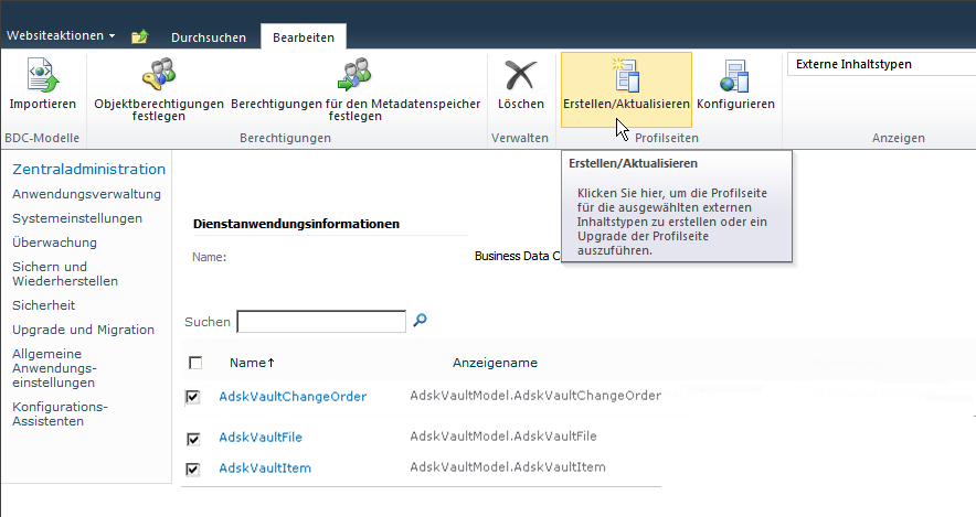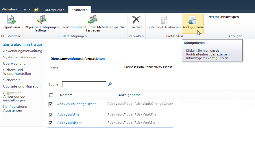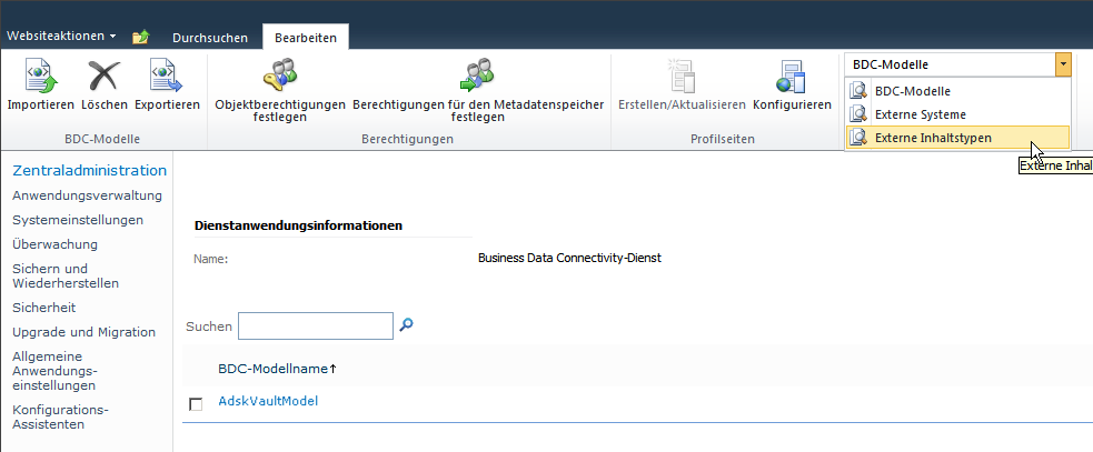 Die erste ist die Installation des BCS-Modells. Das BCS-Modell ist für die Kommunikation mit Autodesk Vault erforderlich. Die zweite Aufgabe ist die Erstellung von zwei administrativen Konfigurations-Webseiten und ordnungsgemäß formatierter Listen.