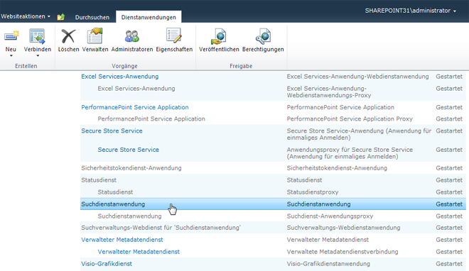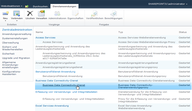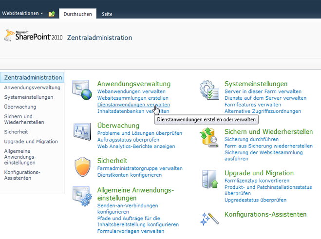 Klicken Sie in der Zentralen Verwaltung unter Anwendungsverwaltung auf Serviceanwendungen verwalten.