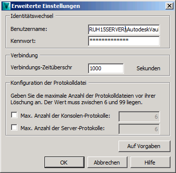 Im Dialogfeld Erweiterte Einstellungen der Autodesk Vault File Server Console können Sie zusätzliche Servereinstellungen vornehmen, z. B. ein Konto für den Identitätswechsel, einen Zeitüberschreitungswert sowie die Anzahl der beizubehaltenden Konsolen- und Serverprotokolle festlegen.