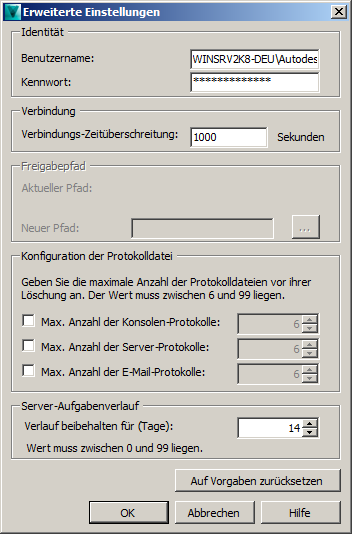 - Ändern Sie im Dialogfeld Erweiterte Einstellungen den Benutzernamen in MyDomain\AutodeskRemote, und geben Sie das entsprechende Kennwort ein.