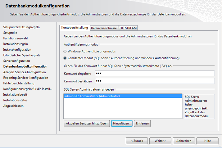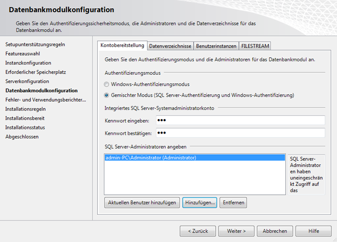 - Fügen Sie das lokale Administratorkonto (oder das gewünschte Konto) als SQL Server-Administrator hinzu. Nur Windows-Benutzer, die in diesem Dialogfeld eingetragen sind, verfügen über umfassende Rechte, wenn sie sich beim SQL-Server anmelden. Alle anderen Anmeldungen bei Windows werden als Gastkonten geführt.