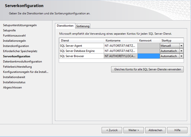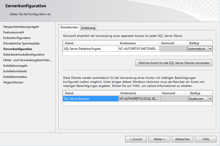 - Wechseln Sie im Fenster Serverkonfiguration zur Registerkarte Dienstkonten.
