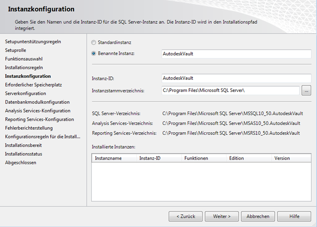 - Wählen Sie im Fenster Instanzkonfiguration die Option Benannte Instanz, und geben Sie den Namen AutodeskVault ein.