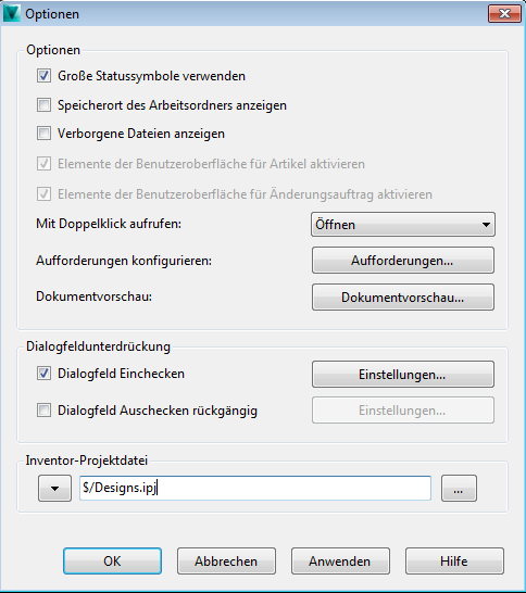 Mit dem Dialogfeld Auschecken rückgängig sind bestimmte Einstellungen verknüpft. Sie können für dieses Dialogfeld Vorgabewerte angeben und festlegen, ob das Dialogfeld eingeblendet werden soll, während Sie in einem Tresor Dateien bearbeiten.