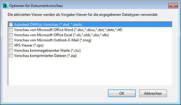 - Eine Liste der auf Ihrem aktuellen System installierten Anwendungen wird im Dialogfeld Optionen für Dokumentvorschau aufgeführt. Hier können Sie bestimmte Anwendungen für die Vorschau von Dokumenten im Vorschaufenster konfigurieren.