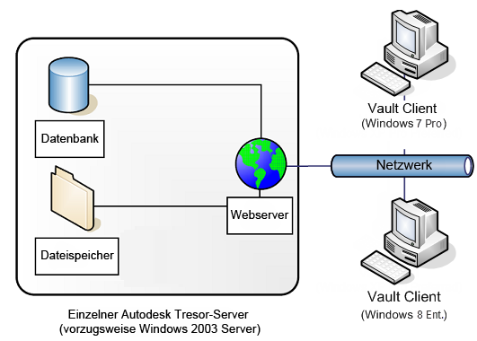 Der Tresor-Dateispeicher kann auf einem anderen Computer eingerichtet werden. Bei Verwendung eines externen Dateispeichers müssen entsprechende Berechtigungen und Konten eingerichtet werden. Der Tresor unterstützt zwei grundlegende Konfigurationen des Dateispeichers: