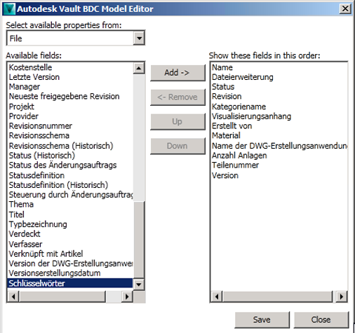Mit der Anwendung Autodesk.BDCModelEditor im Einrichtungsordner können Sie die Liste der Vault-Eigenschaften bearbeiten, die für SharePoint. zur Verfügung gestellt werden. Alle benutzerdefinierten Vault-Eigenschaften (UDPs) können in SharePoint zur Verfügung gestellt werden. Im Folgenden werden die Vorgabeeigenschaften und die Anzeigeeinstellungen für Listen und Profilseiten aufgeführt.