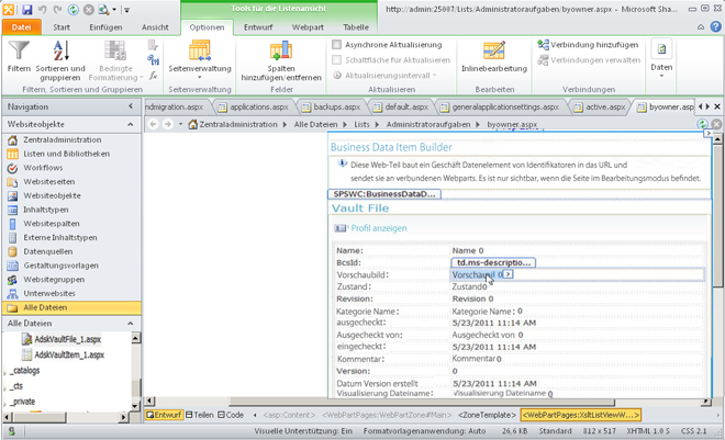 Die Sharepoint 2010-Integration wird mit Microsoft Business Connectivity Services (BCS) durch die Verwendung von Autodesk Vault Professional mit Microsoft SharePoint 2010 erreicht.