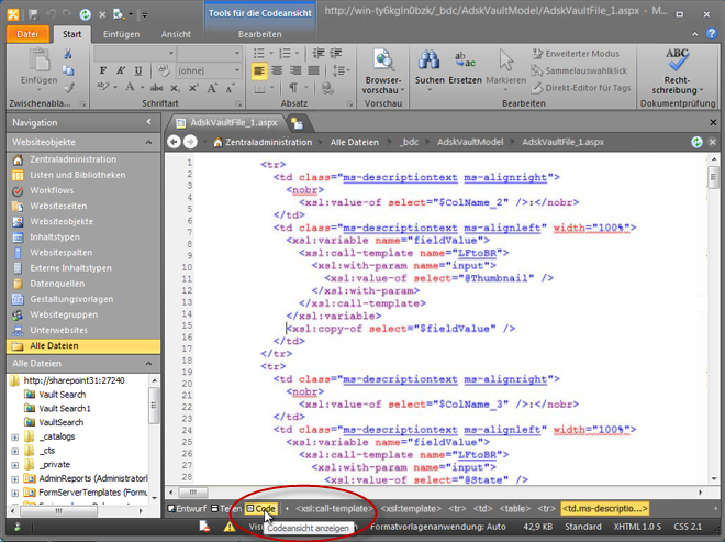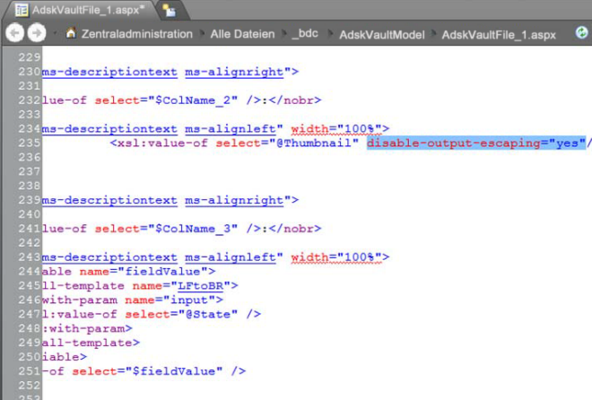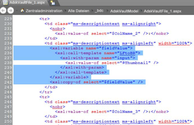 Wenn Sie manuell eine SharePoint-Liste erstellen, die auf Vault zugreift, müssen Sie die aspx-Seite bearbeiten, die diese Liste enthält. Kopieren Sie den unten markierten Abschnitt, und fügen Sie ihn ein.