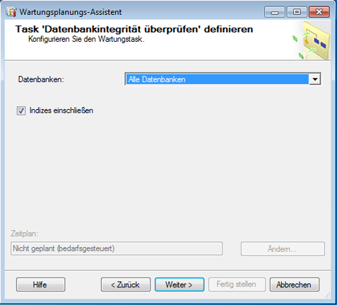 - Wählen Sie im Aufgabendialog Datenbankintegrität überprüfen definieren aus der Datenbankliste den Eintrag Alle Benutzerdatenbanken, und aktivieren Sie das Kontrollkästchen neben Indizes einschließen.