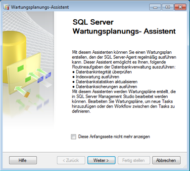 - Klicken Sie mit der rechten Maustaste auf den Ordner Wartungsplan, und starten Sie den Wartungsplan-Assistenten. Wenn das folgende Dialogfeld angezeigt wird, klicken Sie auf Weiter.