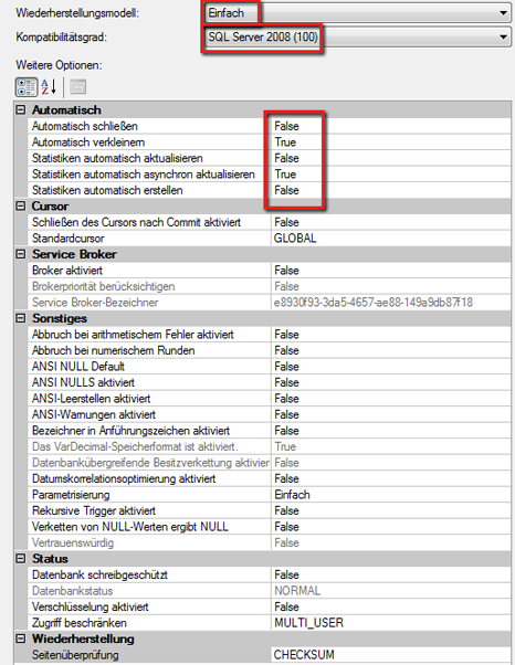 - Ändern Sie auf der Seite Optionen die Option Wiederherstellungsmodell auf Einfach, den Kompatibilitätsgrad auf SQL Server 2008 (100) und den Wert in der Dropdown-Liste Automatisch verkleinern auf False. Alle Werte unter Automatisch sollten wie nachfolgend gezeigt festgelegt werden.