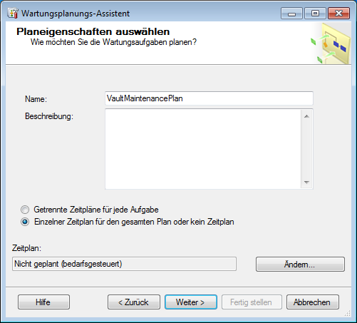 - Geben Sie im Dialogfeld Planeingenschaften auswählen als Namen Vault Wartungsplan ein, und klicken Sie auf die Schaltfläche Ändern, um den Plan einzurichten.