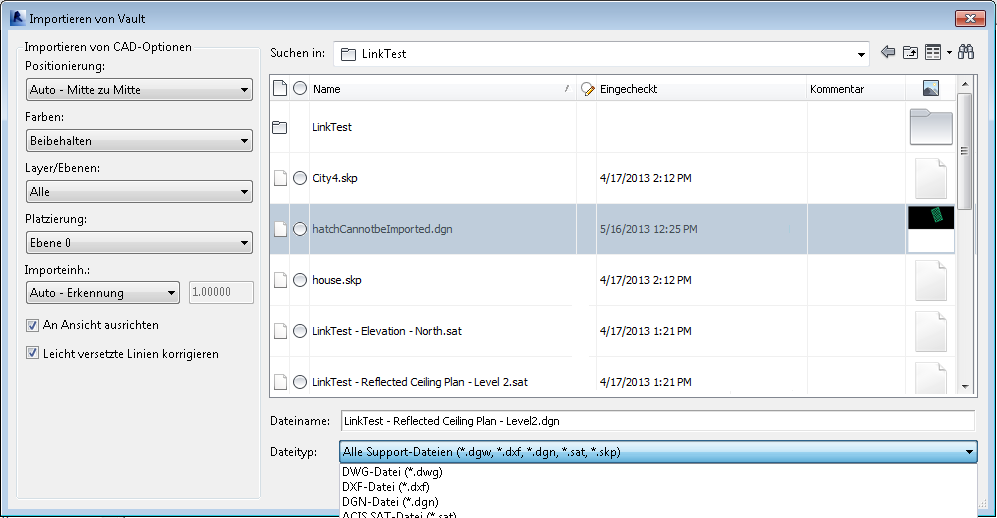 Sie können im Dialogfeld Aus Tresor verknüpfen eine Datei im Tresor auswählen, die mit dem aktuellen Revit-Projekt verknüpft werden soll, und Positionsoptionen für die verknüpfte Datei angeben.