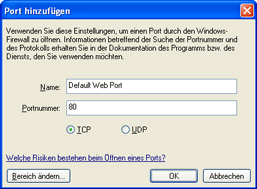 - Geben Sie im Dialogfeld Anschluss hinzufügen im Feld Name "Vorgabemäßiger Webport" sowie als Anschlussnummer 80 ein.