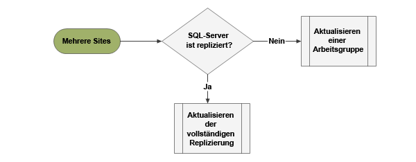 Es wird empfohlen, als Erstes die Site mit der schnellsten Verbindung zum SQL-Server zu aktualisieren. Wenn Sie bereit sind zum Durchführen der Aktualisierung, befolgen Sie die im Abschnitt Einzelne Site aufgeführten Schritte. Aktualisieren Sie den ausgewählten Server auf die endgültige Version und das neueste Service Pack, bevor Sie mit den anderen Sites fortfahren.
