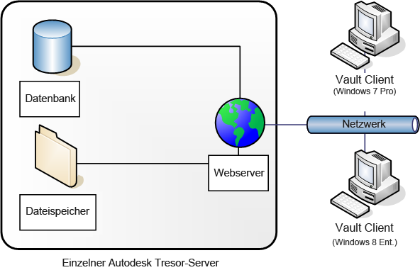 Der Autodesk Vault Server ist eine Webanwendung, die über Web-Dienste die Kommunikation zwischen Clients und Server verwaltet. Die Interaktion zwischen Clients und Server funktioniert ähnlich wie die Kommunikation zwischen Webbrowser und einer Site im Internet. Die Web-Dienste verwenden Standard-HTTP-Methoden und kommunizieren per Voreinstellung über den Webserver-Port 80. Für Konfigurationen mit mehreren Benutzern ist Microsoft IIS erforderlich.