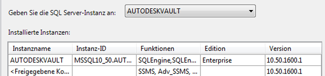 - Wählen Sie die SQL-Instanz AutodeskVault.