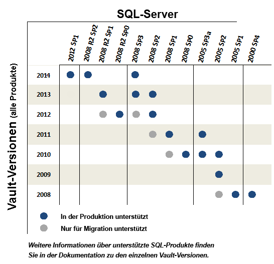 Das folgende Diagramm zeigt eine Übersicht über die kompatiblen Versionen von Vault und SQL, dargestellt durch dunkelblaue Punkte. Die hellgrauen Punkte stellen den empfohlenen Aktualisierungspfad dar. Richten Sie sich nach der auf dem Wiki verfügbaren Vault-Versionsdokumentation, um die Kompatibilität zwischen Vault- und SQL-Produkteditionen sicherzustellen.