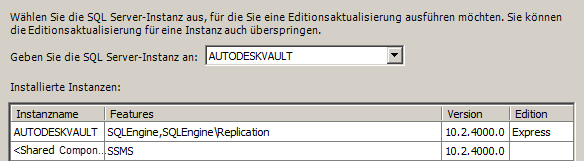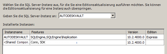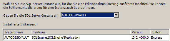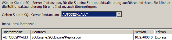 - Überprüfen Sie die Version oder den Produktschlüssel für die Vollversion von SQL 2008. Wechseln Sie dann zum Instanzauswahlfenster, und wählen Sie die Autodesk Vault-Instanz.