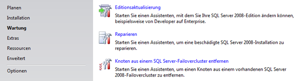 - Starten Sie das Setup der Vollversion von SQL 2008 über den Installationsdatenträger. Wählen Sie die Wartungsoption, und starten Sie den Assistenten für die Editions-Aktualisierung.