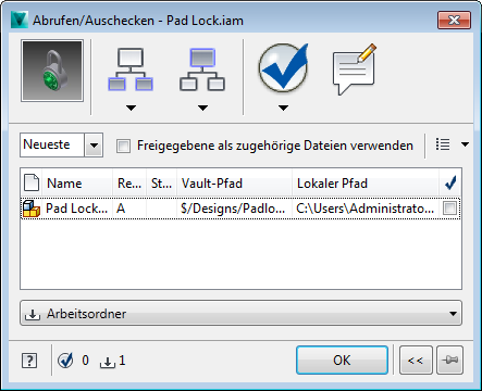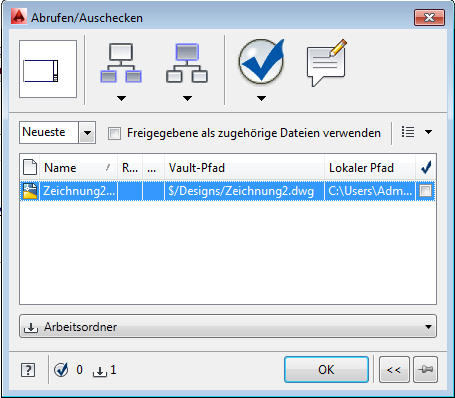 Reduziertes Dialogfeld Abrufen/Auschecken: AutoCAD-Vault-Zusatzmodul 2014