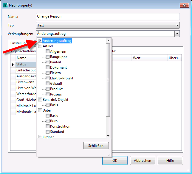 - Aktivieren Sie in der Dropdown-Liste Verknüpfungen das Kontrollkästchen Änderungsauftrag, damit die neue Eigenschaft mit Änderungsaufträgen verknüpft wird.