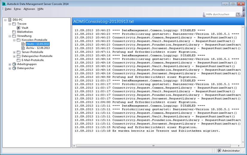 - Wählen Sie im Navigations-Browser von ADMS Console eine Protokollgruppe im Ordner Verwaltung aus. Es wird eine Liste der aktuellen Protokolle für diese Gruppe angezeigt.