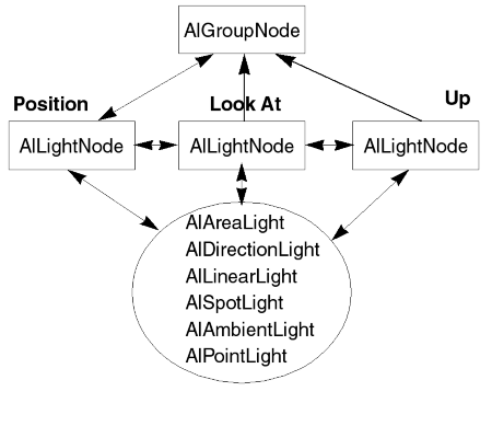 This diagram shows a light and its three light DAG nodes, grouped under a common group node. To create this structure, instantiate and create one of the several different light types. The three light nodes (the position, look at, and up DAG nodes) are created. The three light DAG nodes are grouped under a common group node. All of the different light types make use of the position DAG node; however, only the AlSpotLight makes use of the look at and up nodes.