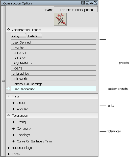 Construction Options) to ensure the quality of your models reflects your construction criteria. Construction options change, depending on the CAD application the data will be sent to downstream (if any). The presets available are good starting points. You can copy and customize the settings for your specific needs.