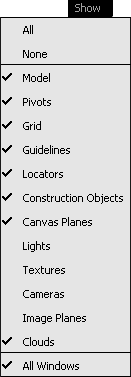 Control the display within a modeling window through its embedded Show menu. Press the Shift key to toggle more than one item at a time.