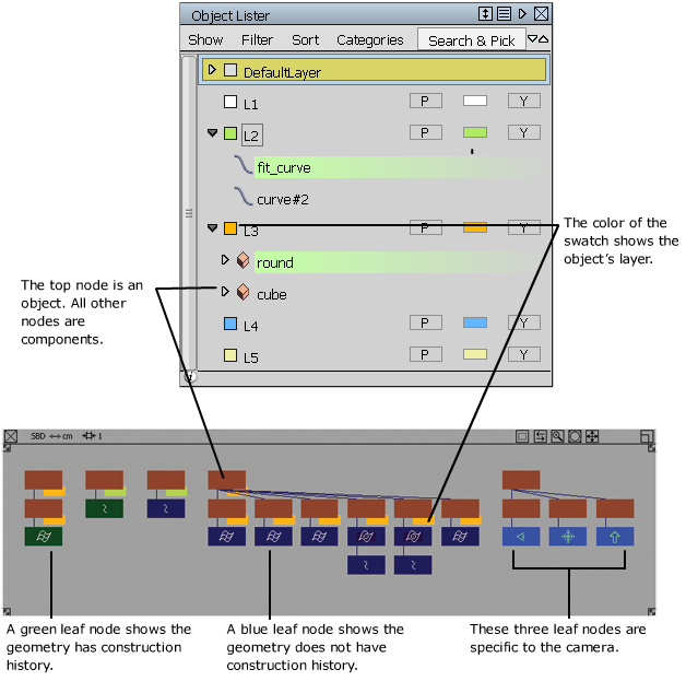 You can see how this hierarchy of objects is represented in the Object Lister and the Scene Block Diagram (SBD) window.