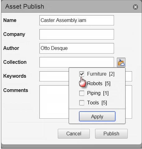 - The Asset Publish dialog box appears with the asset title and author text field pre-populated. You may also add your company name, keywords, and comments to the dialog box.