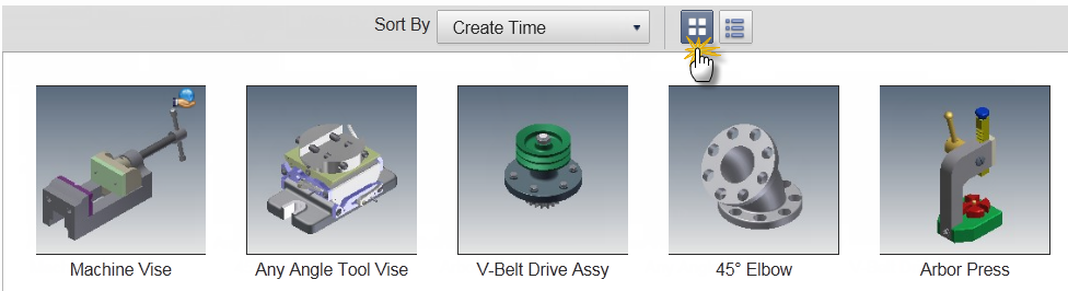 Cloud-based assets appear in a document list to the right of the display menu. The assets can be displayed as graphical icons in the default