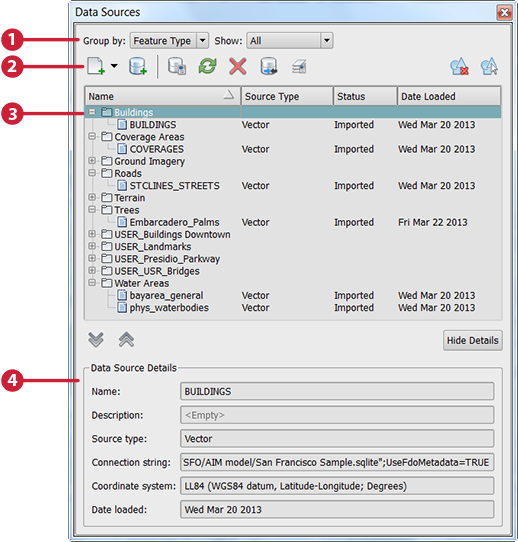 Group items by feature type or by source type. By default, all data stores are listed under their feature type, for example, all building sources appear under "Buildings." To group them by source type (vector, 3D models, and so on), switch to Source Type. |