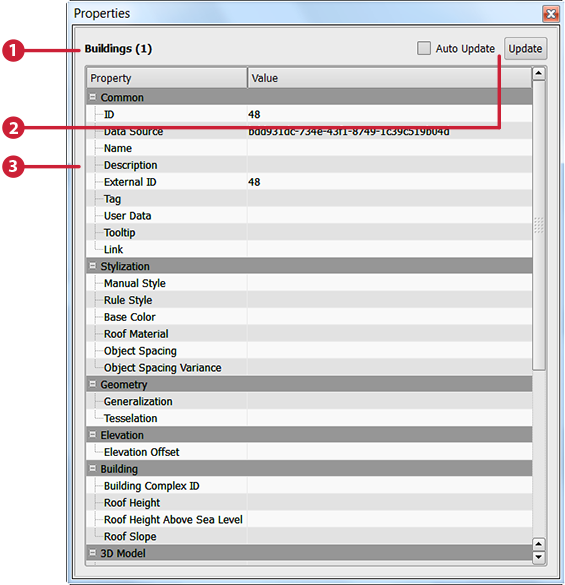 - Update Options — Updates the property values after you make a change, or displays these changes automatically.