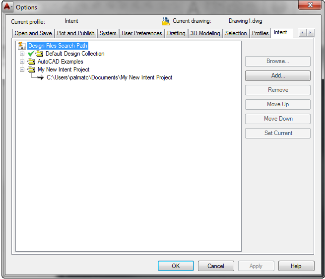 - In the Options dialog box, Intent tab, expand a design collection folder to show the path or paths in the collection.